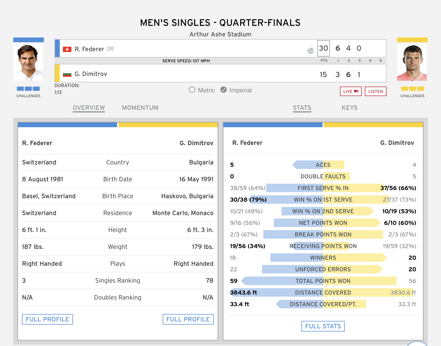 2019 US Open QF: Federer vs. Dimitrov