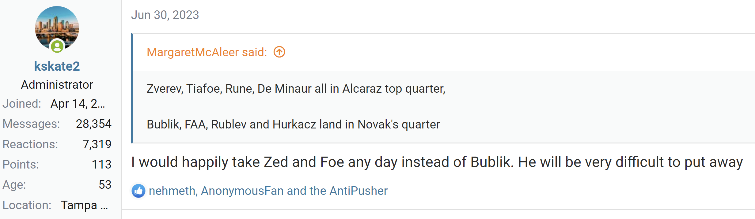 Sweet! Rublev through. If I had my hands on the string of fate and could gift a random player with a Slam title, it might be Rublev.