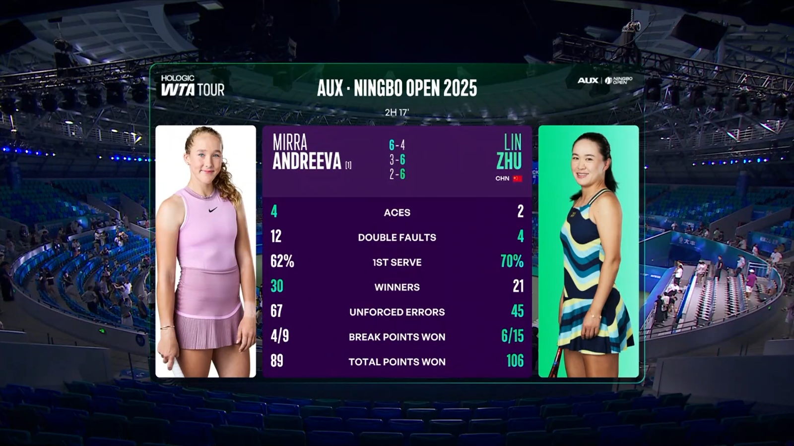 It was a good match from Lin to defeat Andreeva, who to me is still trying to adjust playing the tour full time., she hasnt played well since Wimbledon, at times looks miserable on court to me, she isnt at the level when she won back to back WTA1000 earlier in the year.Lin Zhu the 31 yo wildcard from China has beaten the topseed Andreeva in another 3 setter in Ningbo Open - great job well done. And welcome back from injury - now #170 in the rankings.