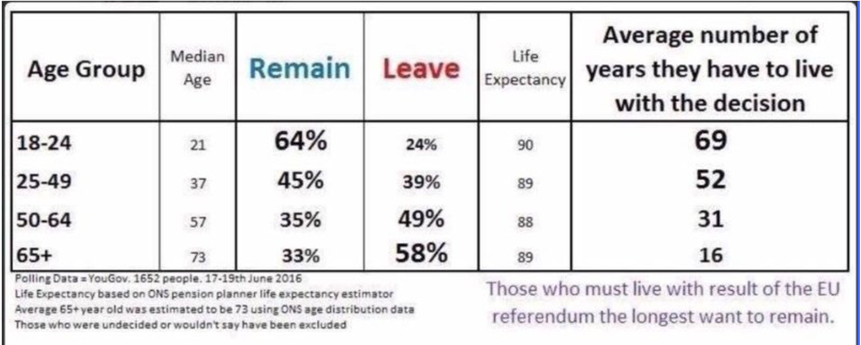 Already even some Leave campaigners are pointing out that the vote was just advisory. Good luck with that! The old have betrayed the aspirations of the young for a dream that never really existed