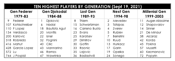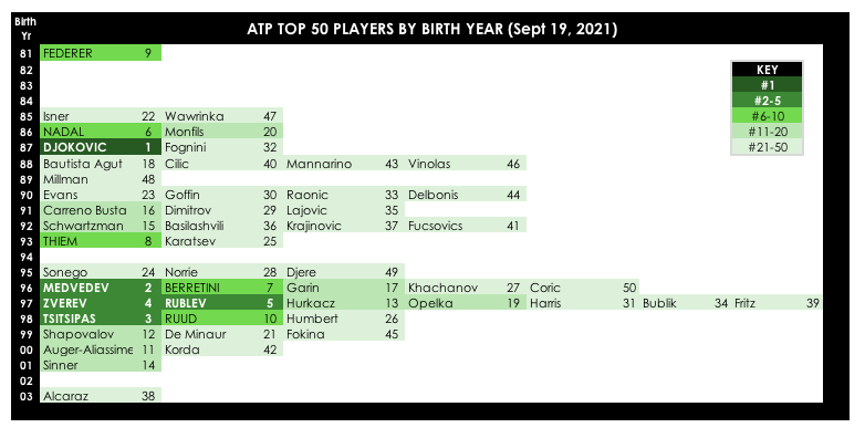 A large percentage of top players were born in the 1996-98 range, with six of ten top 10 players born in those three years. The other four are Federer (1981), Nadal (1986), Djokovic (1987) and Thiem (1993). Furthermore, ten of the top 14 were born in 1996 or later, with Felix Auger-Aliassime (b. 2000), Denis Shapovalov (b. 1999), Hubert Hurkacz (b. 1997), and Jannik Sinner (b. 2001) rounding out #11-14.