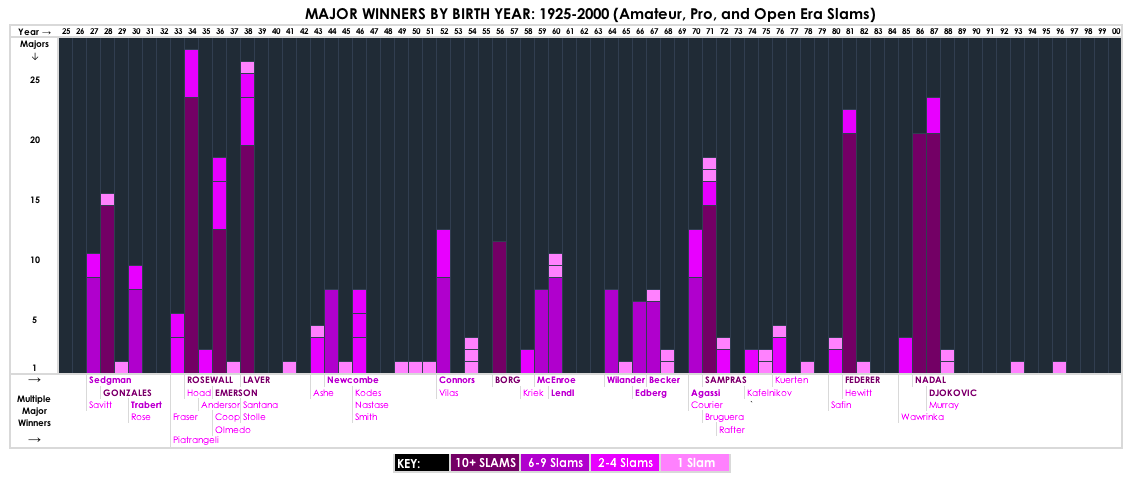To clarify the above chart, the graph itself includes all Slam winners by birth year, with one cell per Slam. The names listed below the graph are all multiple majors winners (2+), and the key explains the color-coding.