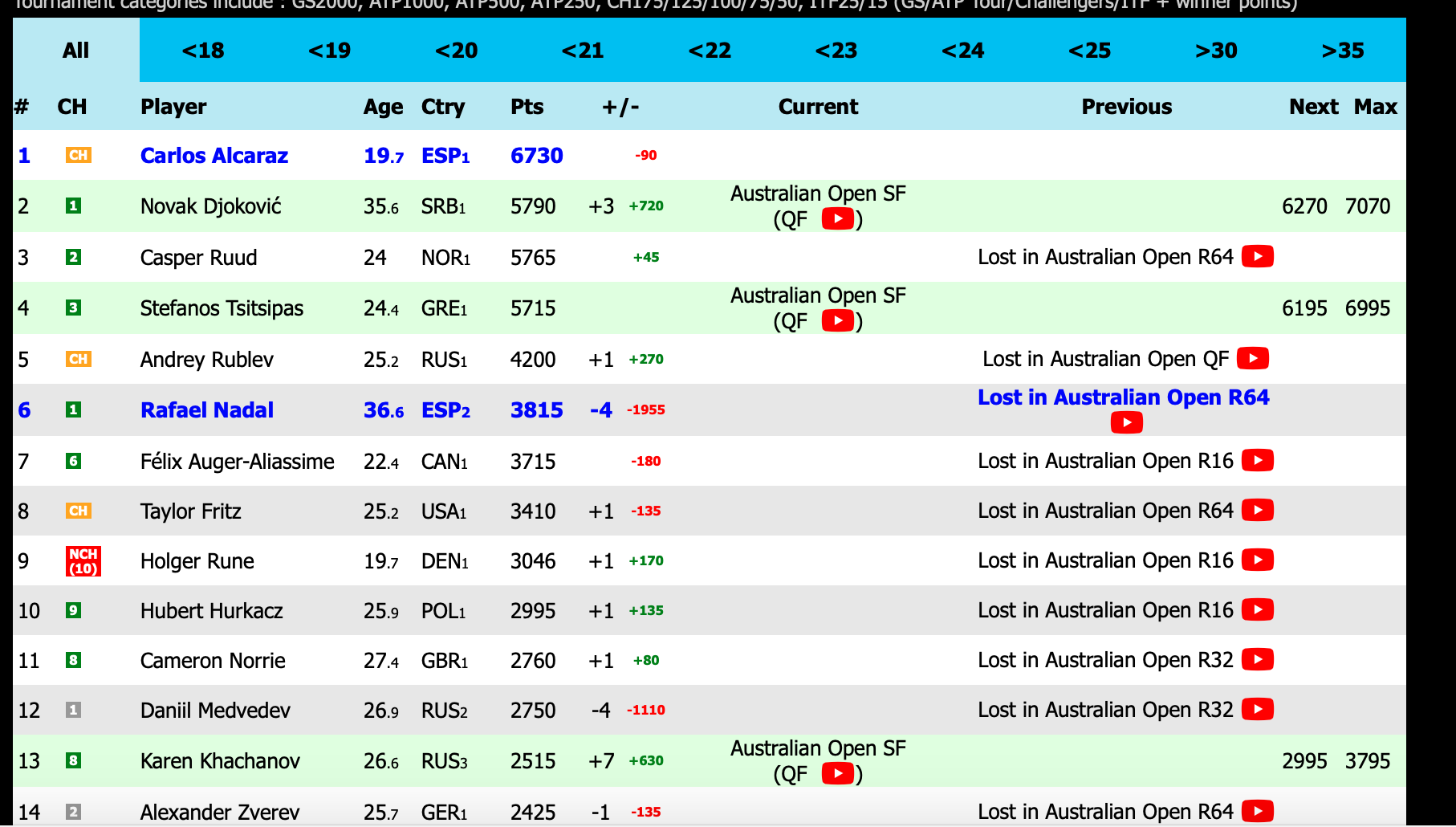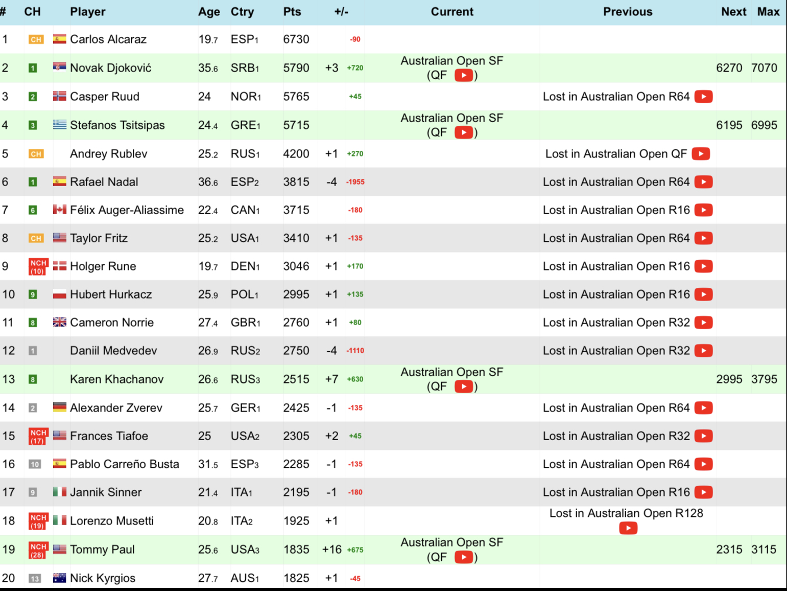 With the early exits of Ruud, FAA,and Medvedev , my calculations have Rafa still in the Top 10, confirm when the AO is finished