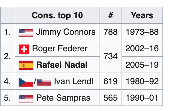 Also, when the official rankings comes out tomorrow, he will be in the Top 10 rankings for 735 consecutive weeks which will be second all time behind Jimmy Connors of 788 weeks. One of the most underrated streaks in Tennis: