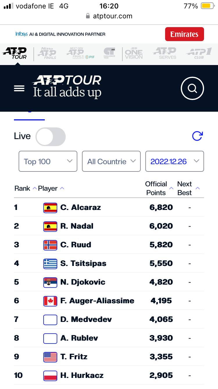 And no, Novak didn't get the 2000 points from his Wimbledon title - the ATP excluded Wimbledon points because they allowed Russian and Belarusian players. If Novak had gotten those points and gone out on the 1st round of just one of the AO or USO, he'd have surpassed Alcaraz's point total. So yeah, asterisk.