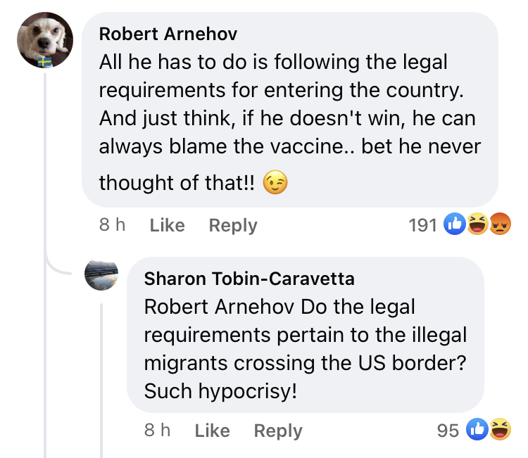 I saw a post on social media claiming its hypocrisy because they allow illegal immigrants in without being vaccinated. Good recommendation there from a fan… :facepalm: