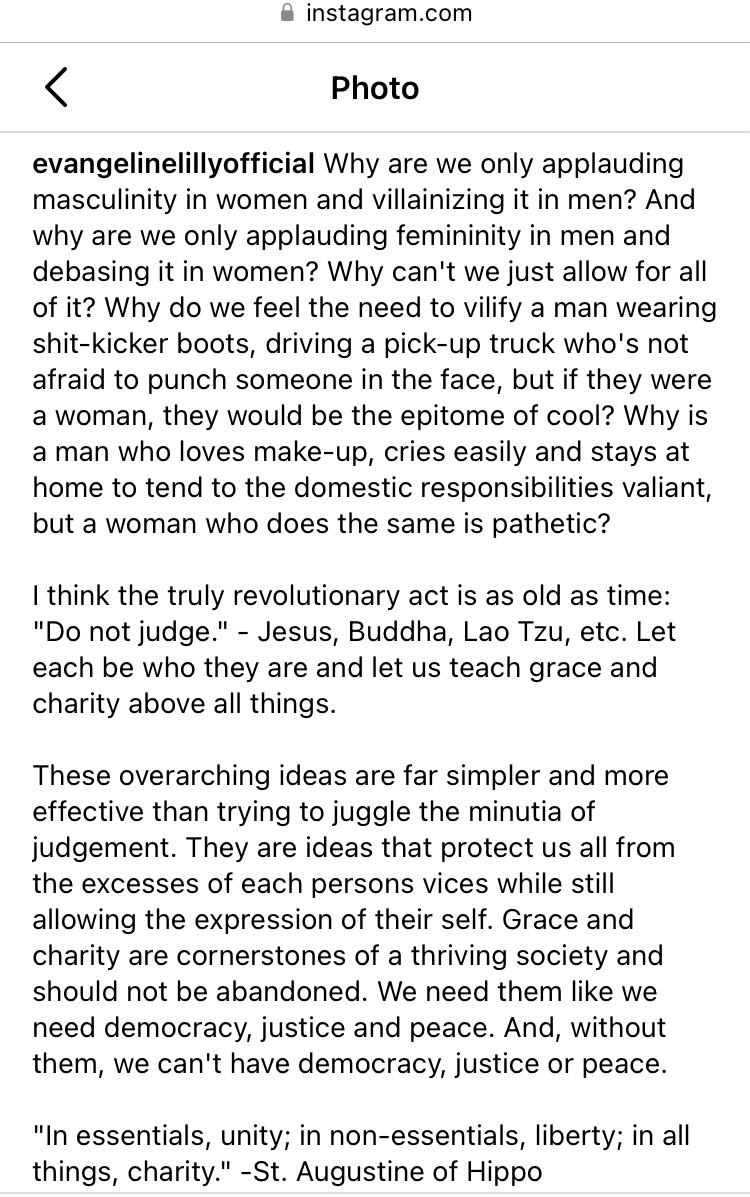 yes I read about this. Bravo to her! I think. the whole thing is becoming so egregious that it's hard for honest people to ignore. I honestly believe that most of the coastal morons who are so convinced about their rectitude lack the capacity to think holistically about what they're doing. In my business we have the greater fools who get drawn into the market when it's at the top, when it's most dangerous to buy. These are the coastal morons. They are destroying civilisation right at a point where we are a generation away from a massive population collapse. Elon wasn't wrong. That sounds hyperbolic but that's exactly what it is. Show me a society in history that's been successful completely overturning the roles. None exist. I'll keep saying it... the Russians are probably sitting around wondering why it took so long to come up with this powerful social virus to destroy the West. I fear for us all...On her Instagram page, Evangeline Lilly has said something wise, which might be a first for modern Hollywood. She’s said something that the intolerant, radical left should ponder - but unfortunately won’t. And then she ends by quoting St Augustine, a Titan of the Church. Good for her - and us!