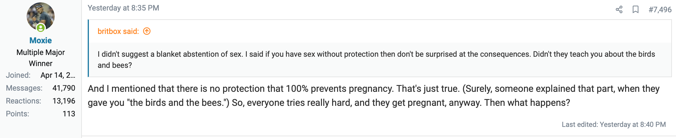 Oh, and not to put too fine a point on it, but the one who gets pregnant is the woman. She's the one with the bigger stakes in the game. She can hope that her husband or partner is on board, but when the musical chairs is over, she's still the one raising a baby. You "can't escape the feeling" that I don't fully accept the responsibility and accountability of women "in this tango." Yeah, right.
