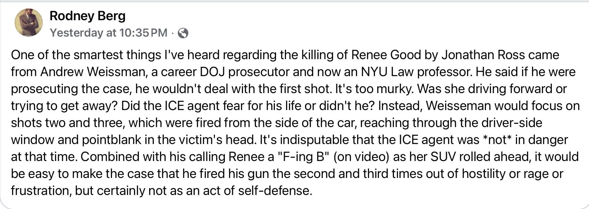Yeah, sure. That all makes perfect sense. But remember, had he let her go, she may have been a danger to others too, including other ICE agents. The killing was an avoidable tragedy, brought to us by a defective political mindset that suggests there can be no consequences to their actions because they're the good guys, default setting.